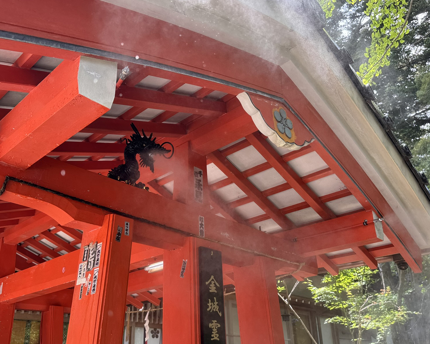 手水は龍の口から清らかな水が流れる趣ある演出を実現。さらに夏場の暑さ対策として手水舎横にミスト設備を設置しました。ミストは肌に触れて蒸発する際に熱を奪いひんやりとした涼しさを感じられるほか空中で気化することで周囲の気温を下げる効果も期待できます。